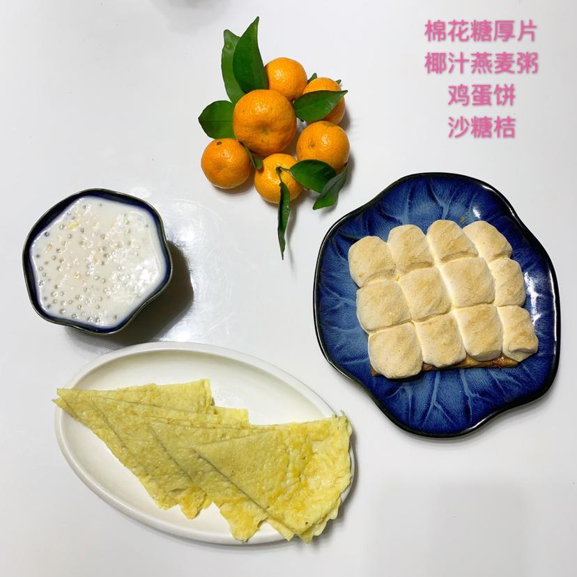 乐儿宝儿妈 做过 早餐•2019年1月9日 早安!【宝贝我爱你】棉花糖厚片&椰汁燕麦藜麦粥&鸡蛋饼&沙糖桔棉花糖厚片是乐乐点的,早就想吃了,我也是好久没有做了,很简单,吐司片抹一层果酱或花生酱,再摆上棉花糖用空气炸锅烤10分钟就OK。椰汁燕麦藜麦粥:椰汁加燕麦煮开,加西米,藜麦,葡萄干即可。#早餐•2019年1月9日# 2019-01-09