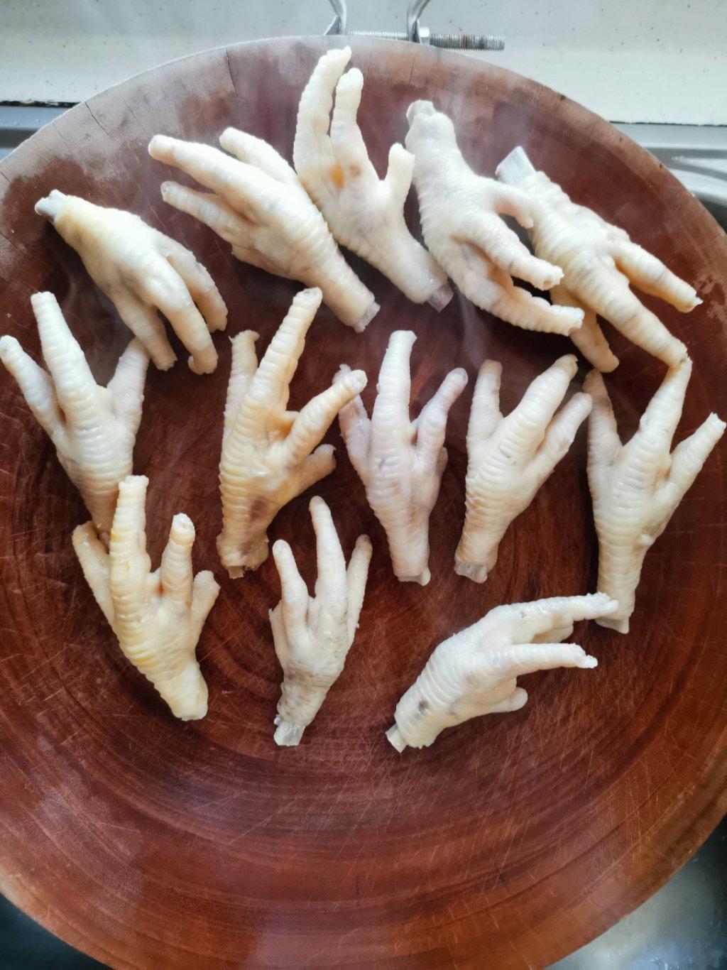 严格按照菜谱来的,鸡爪油炸前弄的比较干,所以没有太爆,炸了三分钟多点,但是为什么最后没有虎皮咩?是不是因为油炸的时间太短了?