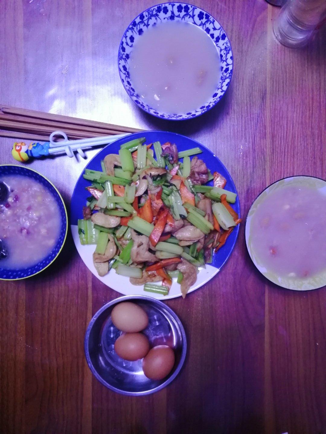 早餐,腊八粥,芹菜胡萝卜炒素肉,煮鸡蛋。