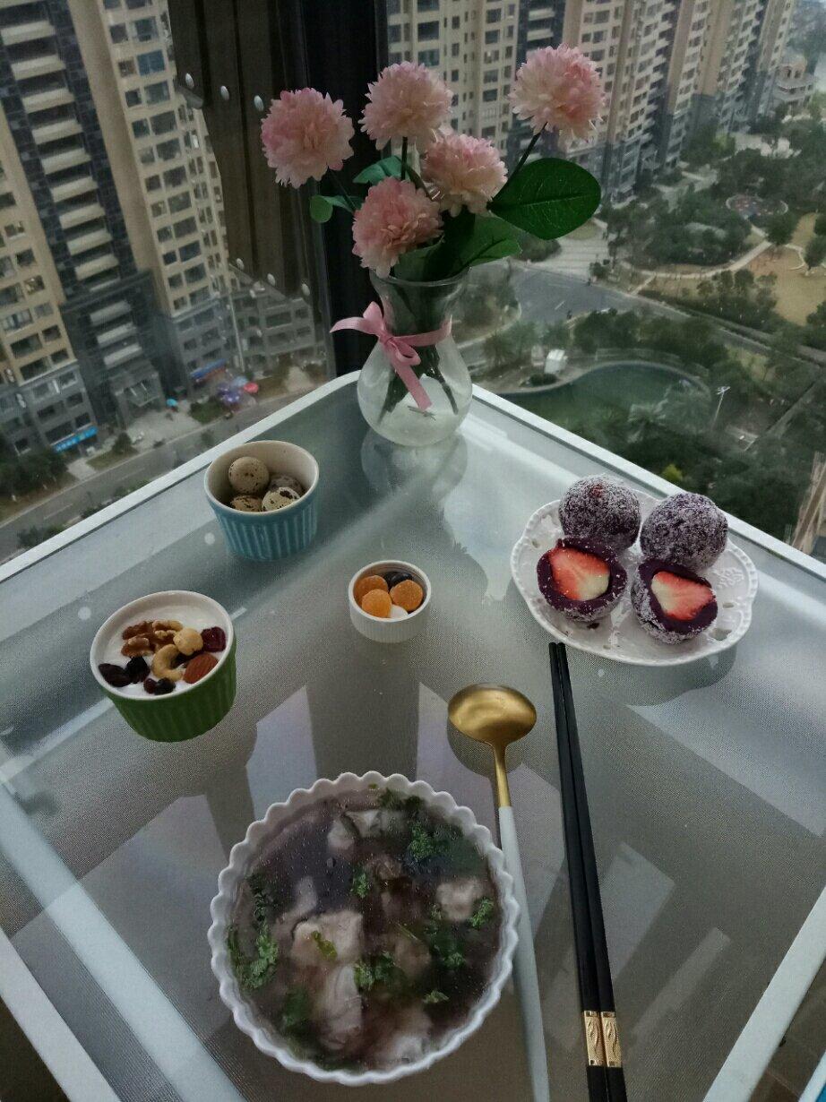 紫菜菜肉小馄饨,椰蓉紫薯草莓大福,鹌鹑蛋,酸奶坚果杯,护眼三宝,螺旋藻。亲们,新周愉快😃
