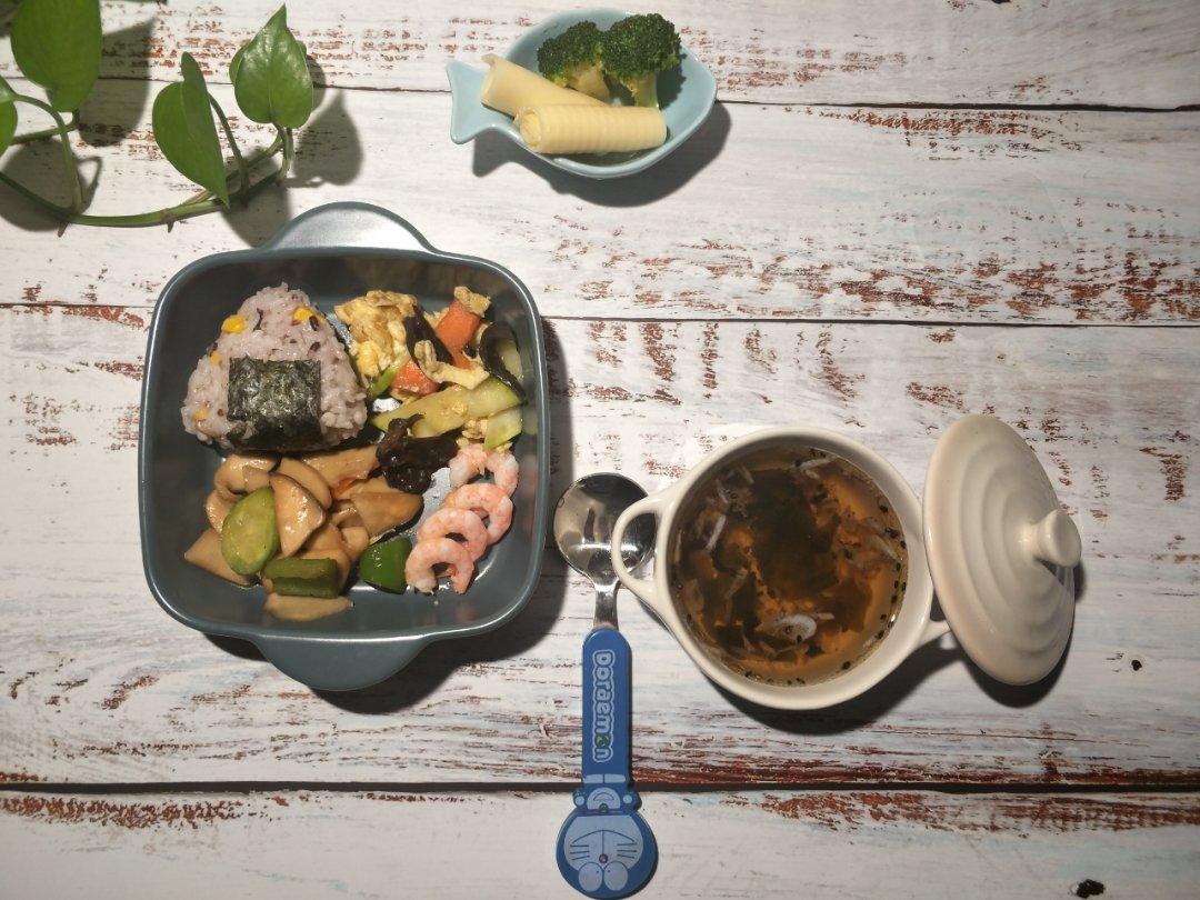 杂粮饭团🍙,蚝油杏鲍菇,角瓜炒鸡蛋,奶酪,西兰花,海带汤。