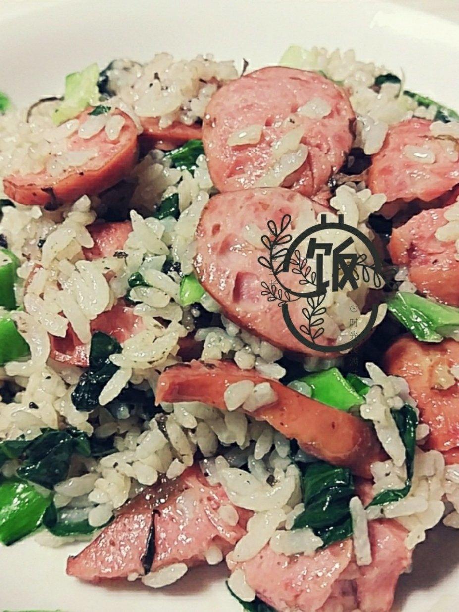 先炒香肠,加入米饭后,再加青菜炒,青菜不容易变暗