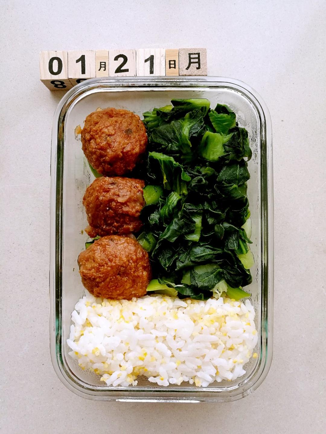 今日便当,红烧肉圆,炒大青菜,三米饭🍱