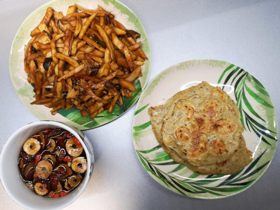 耗油杏鲍菇,虾仁蛋饼,红枣桂圆枸杞茶