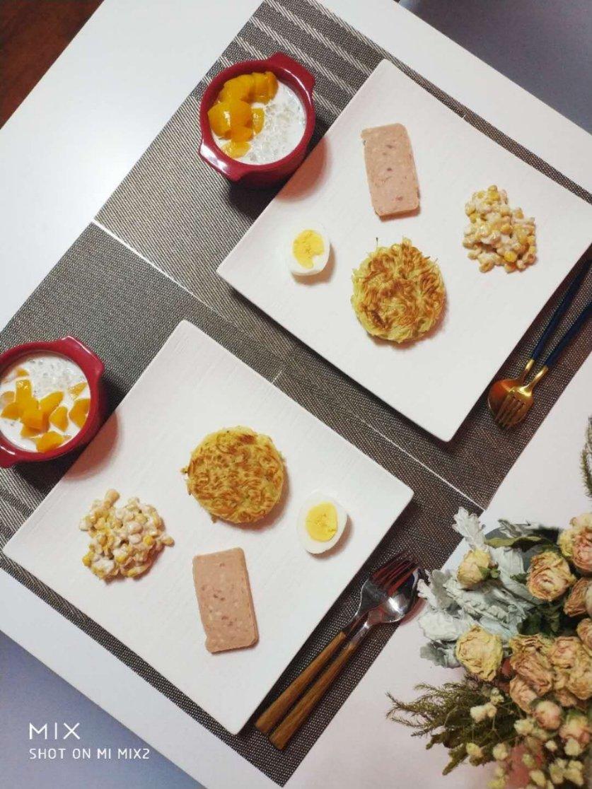 第244天不重复早餐:面条鸡蛋饼+午餐肉+玉米沙拉+煮鸡蛋+牛奶黄桃西米露!