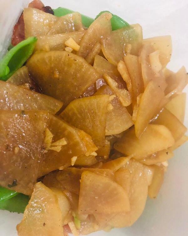 1.青炒萝卜:油,蒜头,酱油,盐巴,加点水煮干即可