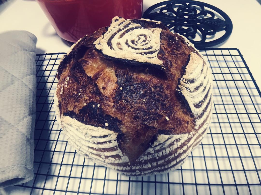 75小时后,正常湿度的欧包,是个不折不扣的大美人儿!这7厘米大的孔也把我吓一跳,比之前不小心做的92%湿度的常规发酵欧包都大!