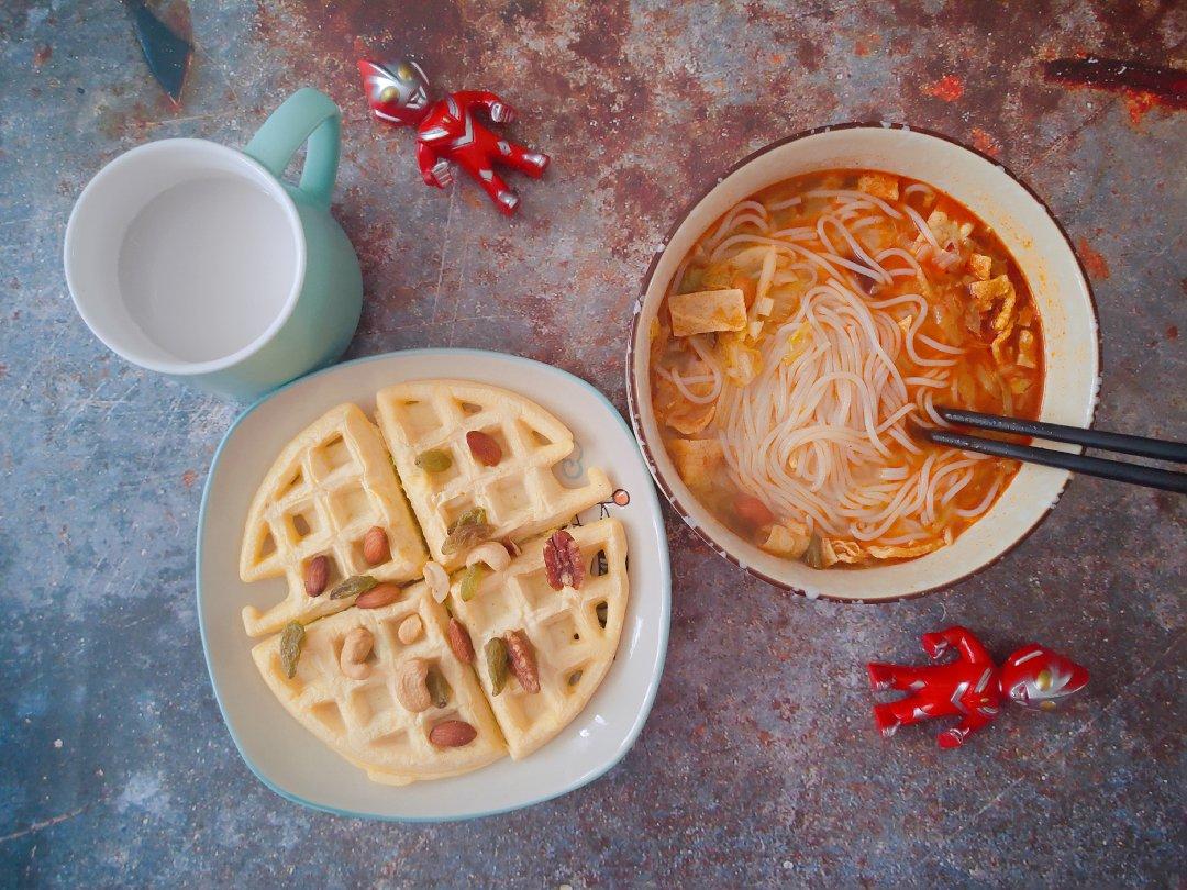 早晨饿醒了。起来现煮大人的螺蛳粉,现烤了小朋友的蔬菜华夫饼。坚果,花生浆,牛奶。早!