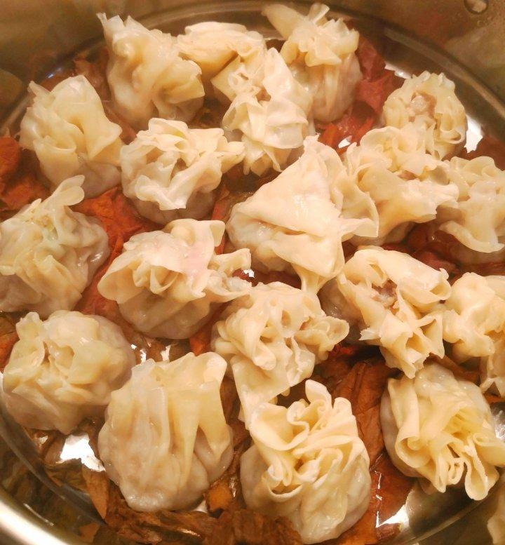 自制烧卖,用荷叶垫了蒸透,蘸点香醋,一口一个,赞👍