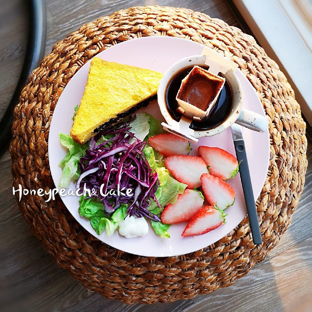 今日早餐:紫米三明治+蔬菜沙拉+草莓+咖啡,早安!🌹☕️