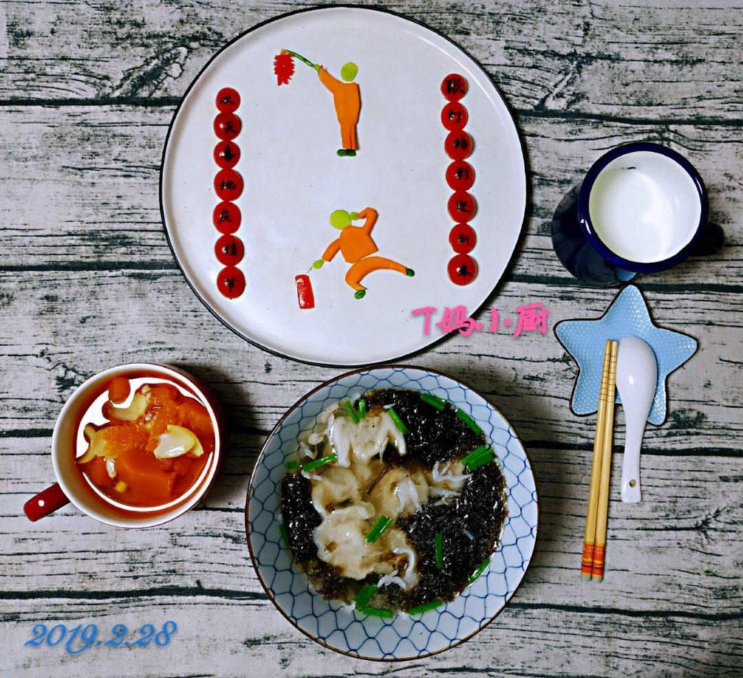 今日早餐:南瓜百合汤+水饺+牛奶+千禧,课间水果:沃柑。餐盘诗句:爆竹声中一岁除,春风送暖入屠苏