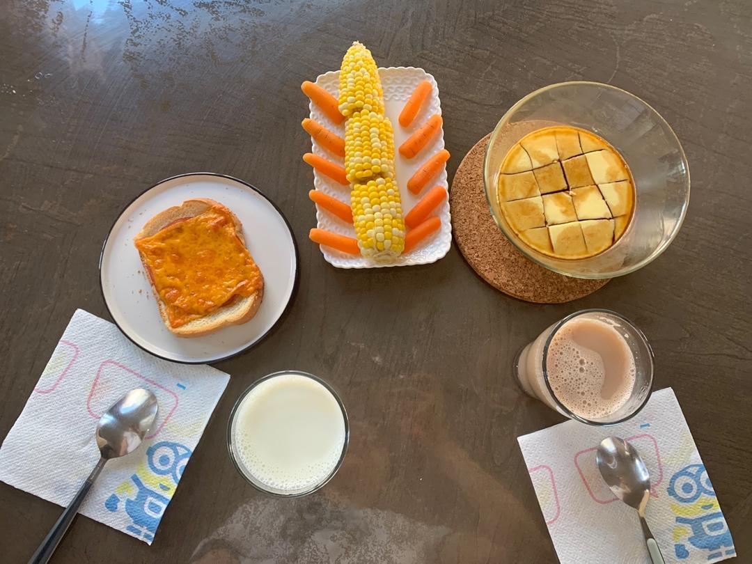 培根吐司 煮玉米小萝卜 蒸蛋羹 & 牛奶豆浆