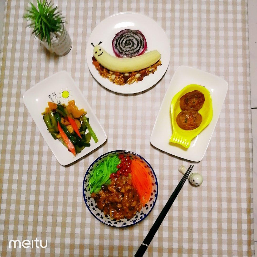 记今日朝食~炸酱面,虎皮蛋,酱黄瓜,香蕉,火龙果
