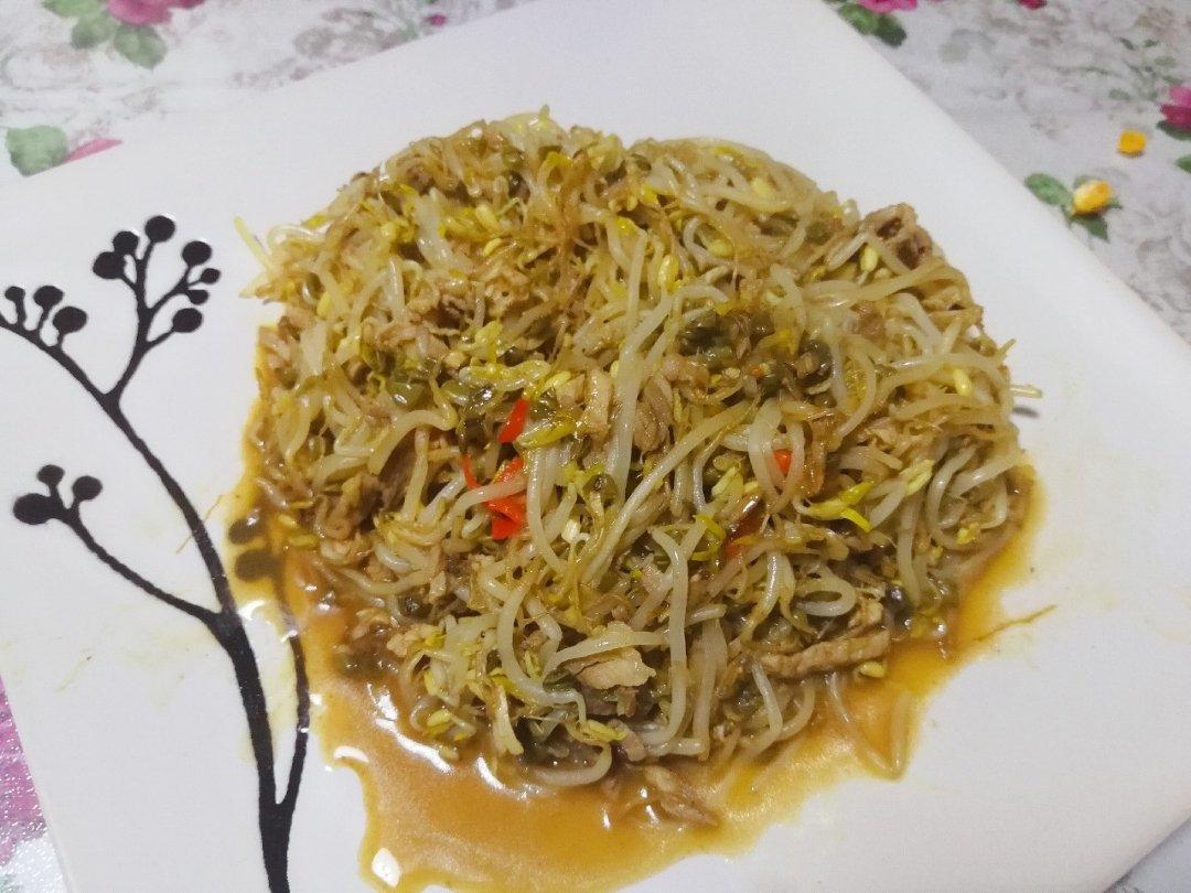 ylmm21 做过 绿豆芽炒肉 绿豆芽+葱姜+小米椒+酱油+醋+糖 1.小米椒(1个)+葱丝+姜丝(粒)爆锅 2.放肉丝,炒熟(变白),加汁(醋1匙+酱油2匙+白糖1小勺),炒匀 3.放豆芽翻炒+适量酱油(1平铲)+加玉米淀粉水(1碗),翻炒收汁,出锅。是我想吃的豆芽的味道,儿子也说:太好吃了! 2019-03-03