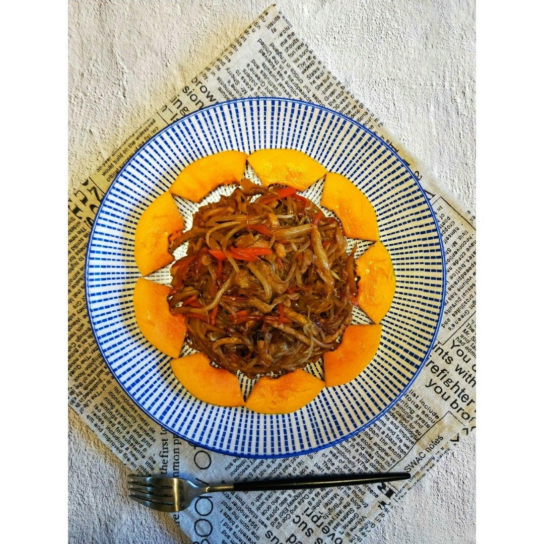 豆芽肉丝胡萝卜丝炒饼丝+木瓜