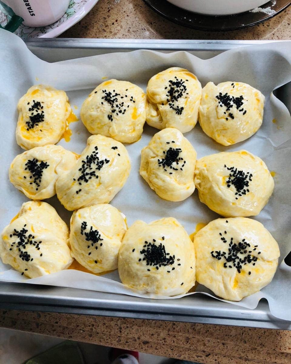 第二次做面包,这次发的不错,多放了点干酵母,但不知道为啥,刷了蛋液表面有点硬