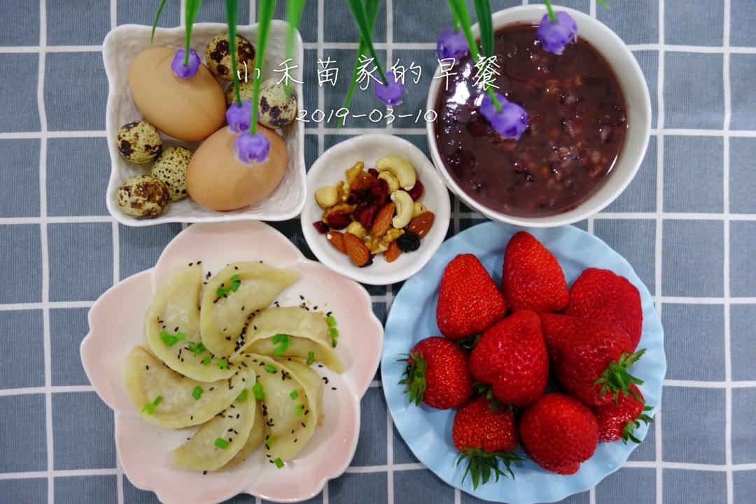 小禾苗家的早餐:生煎饺、水煮鸡蛋&鹌鹑蛋、黑米八宝粥、草莓、混合坚果