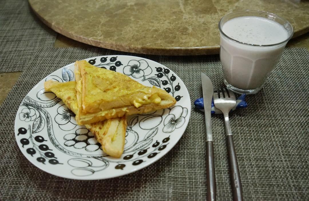 Pongpong 做过 九阳豆浆机食谱 周末早午餐。包片沾蛋液用黄油煎一下夹上芝士片,有点高热量。➕一把黄豆一颗核桃无糖豆浆,免过滤豆浆机太省心省事了! #午餐•2019年3月10日# 2019-03-10