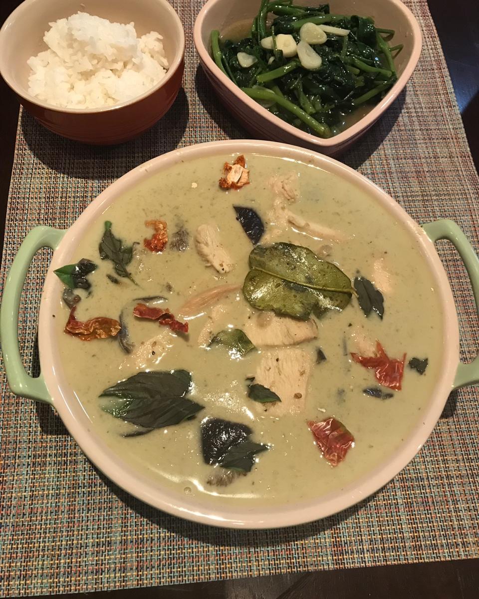 泰式绿咖喱鸡肉、炒茼蒿,米饭。娃居然很喜欢吃。