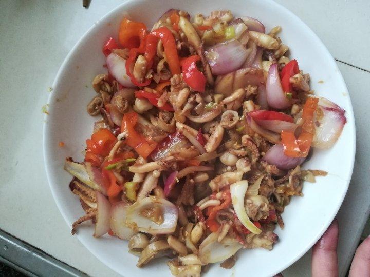 你努力的样子最美 做过 凉拌银耳 爆炒八爪鱼1.清洗八爪鱼🐟多清洗几遍,一定把头上的墨囊完整弄掉,分离头部与四肢,把黑色的一层薄膜撕掉2.准备蒜瓣丁,葱花,辣椒切若干3.准备食用油、盐、耗油、生抽、味达美、料酒4.把八爪鱼肢体分开切成段,锅中添加热水,料酒(除腥),把八爪鱼放进去,煮至水开,捞出来淋水5.锅中放油,油热放葱花,蒜瓣丁,炒锅,放辣椒,八爪鱼,料酒,耗油,生抽,味达美,醋,盐,翻炒至5分钟即吃6.炒菜图片顺序为倒序#@章鱼🐙# 2019-03-19