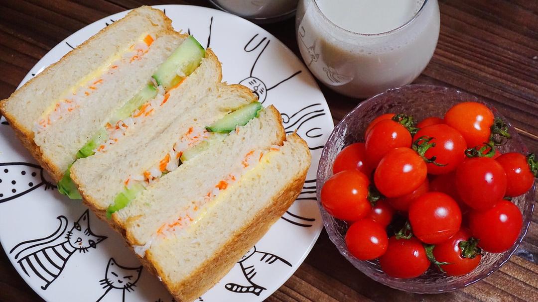 黑豆黄豆浆、蟹柳芝士三文治、樱桃番茄。