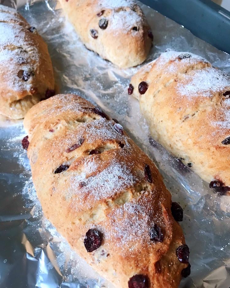 第一次尝试无黄油版低温发酵的全麦蔓越莓软欧包成功