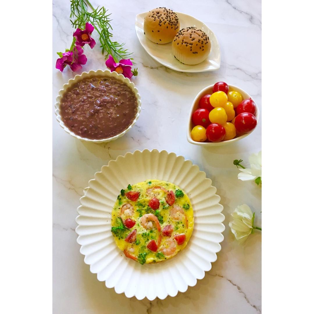 虾仁蔬菜烘蛋🌮红豆黑米粥🥣肉松小面包🍞圣女果🍅