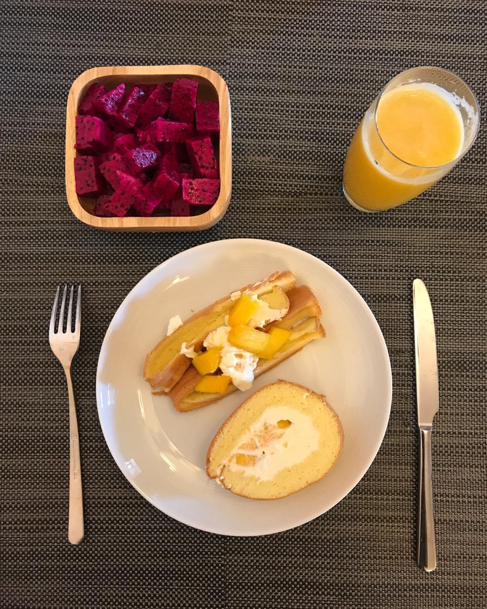 芒果粒蛋糕卷+芒果苹果汁+红心火龙果
