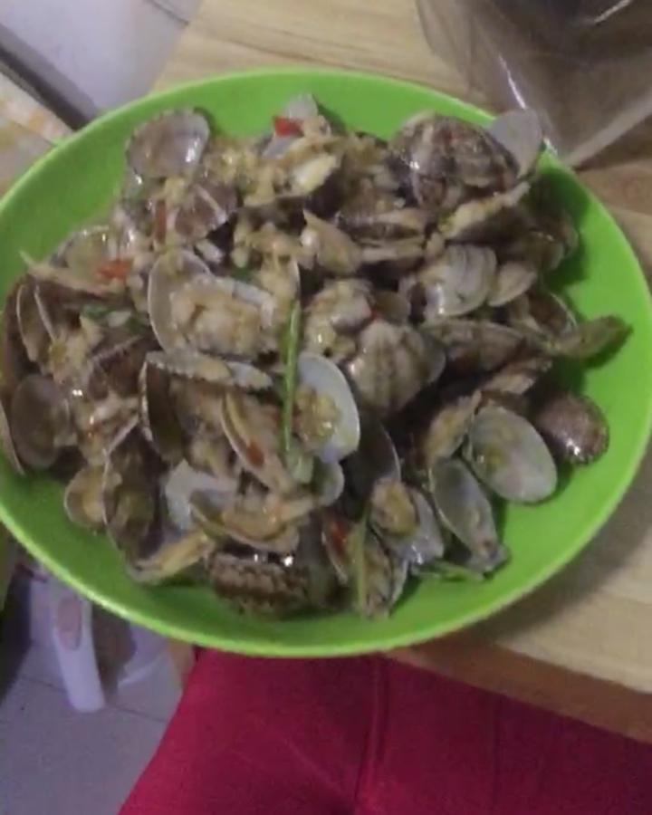 花蛤吐沙,过热水至张开。放辣椒蒜蓉出香味后加花蛤至蒜蓉与花蛤交融。第一次做非常成功