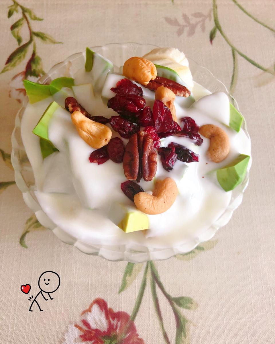 酸奶、牛油果🥑、香蕉🍌、苹果🍎、腰果、蔓越莓、