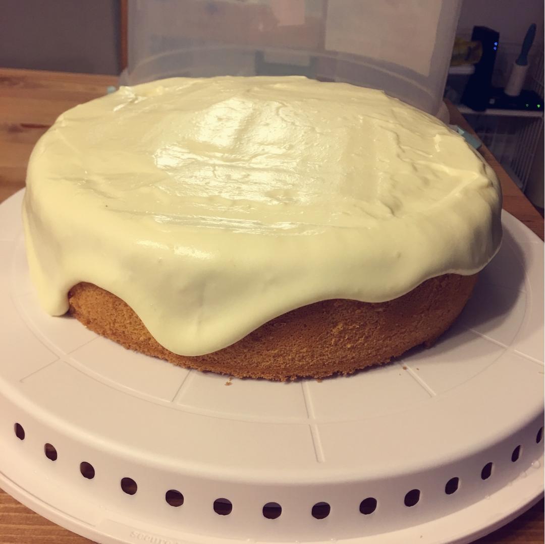 最小的蛋糕模是八寸,于是所有材料翻倍做了一个,最大的感受是:卡仕达酱真是反人类😇😇😇可能是加热的时候搅拌慢了,我的卡仕达酱自始至终都有颗粒!怎么搅拌都去不掉!于是我给自己找了个事:过滤卡仕达酱(图三)😔胳膊酸就是了…过滤出来也不知道还剩多少,搅拌的奶油用的也是之前用剩的也不知道是多少,担心直接加入卡仕达酱会太稀了甚至还打发了一下,这种free style的做法最终还是能用流动效果也是很神奇???总之以后会尽量避开有卡仕达酱的奶盖吧😓😓😓明天切开来看看爆浆效果~