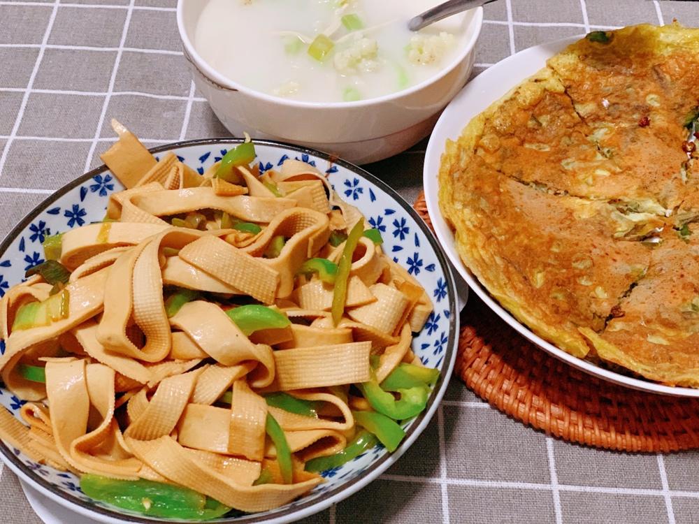 香椿鸡蛋饼、尖椒炒豆腐皮、花菜汤