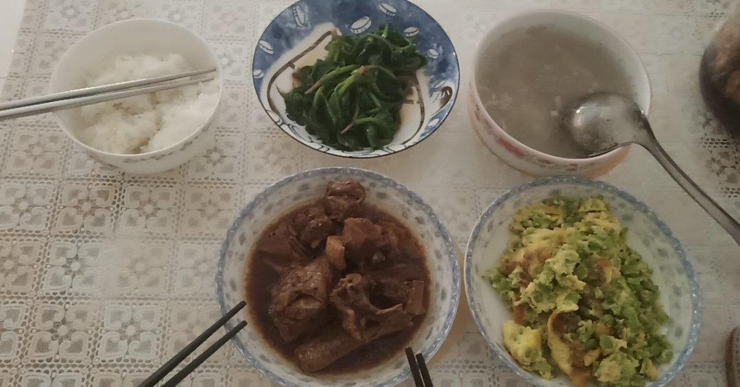吉星高照_ompe 做过 2019年04月10日 20190408午餐:炒菠菜,肉饼汤,焖鸭肉,苦瓜炒蛋20190409午餐:煎牛排,黄瓜炒肉,炒菜心,排骨芋头汤20190410午餐:荷兰豆炒香肠,土豆丝,上海青,肉饼汤 2019-04-10