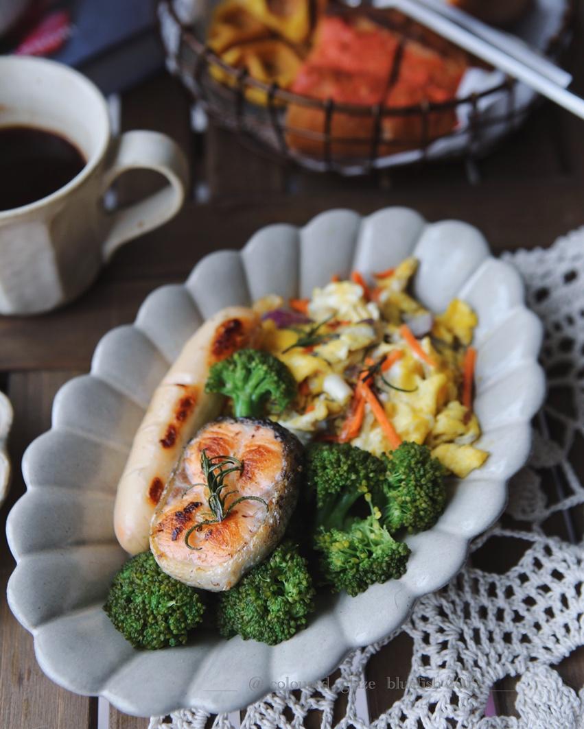 洋葱炒鸡蛋,香煎三文鱼,三文鱼肠,甜橙,咖啡