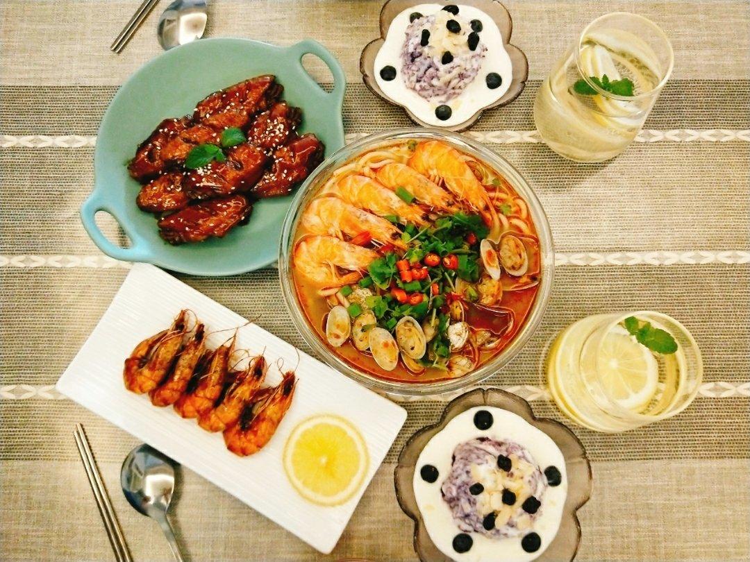 可乐鸡翅,秘汁大虾,花甲米线,紫薯酸奶泥!