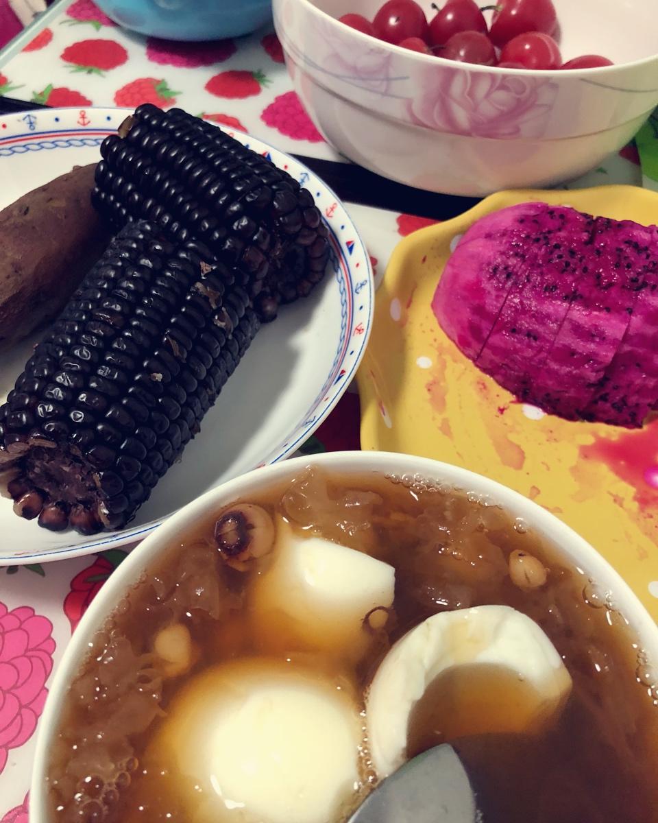 红枣莲子银耳汤,鸡蛋,玉米,山芋,火龙果,千禧