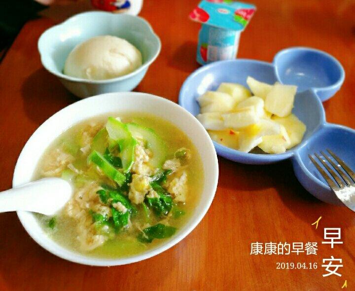小学早餐第15餐:蔬菜蛋花汤,小馒头。水果,酸奶。