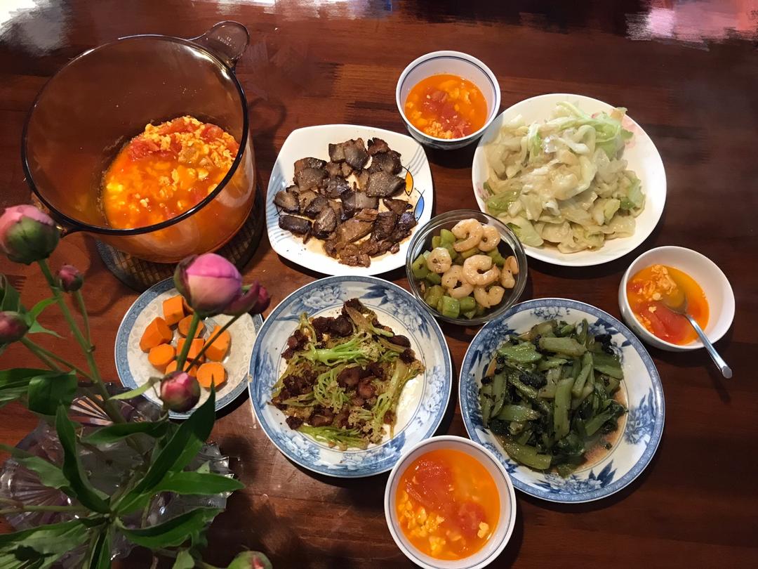 #晚餐•2019年4月19日#周六午餐:黄瓜炒虾仁,豆豉炒牛皮菜,醋溜莲白,香肠菜花,烤肉,卤面筋,蒸红薯,杂粮米饭,番茄蛋汤。