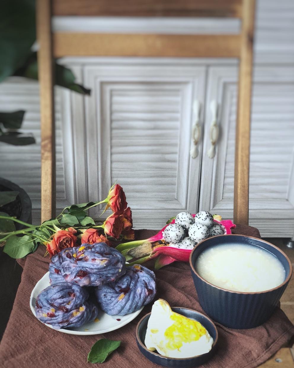 朴食素心 做过 早餐•2019年4月22日 #早餐•2019年4月22日#家有小学生早餐打卡D174星空果干画卷、二米粥、火龙果、煎蛋。碟豆花汁煮多了,留着做了几个花卷,比预计的颜色深了,不够满意!又一次被群友提醒打卡,记忆力堪忧……😂😂 2019-04-22