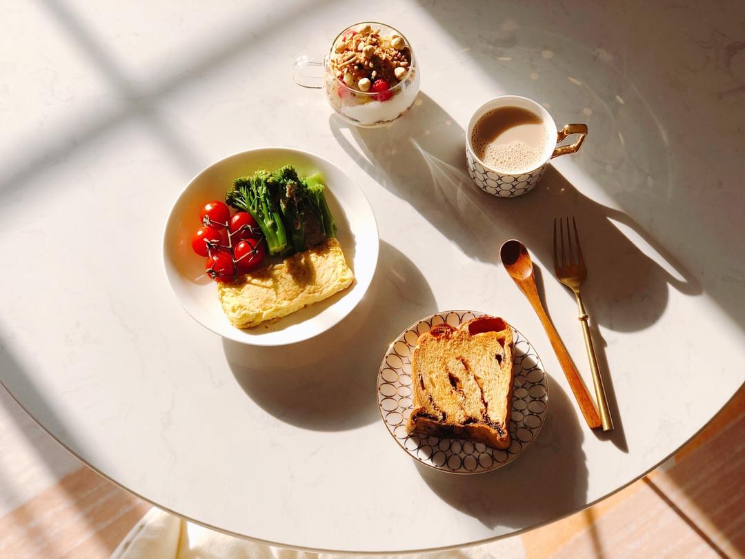 西瓜波妹儿 做过 早餐•2019年4月26日 黑糖吐司、厚蛋烧、西兰苔沙拉、小番茄、水果谷物酸奶、枫糖奶茶#早餐•2019年4月26日##一人食##西瓜🍉的早餐🥣##沙拉沙拉##酸奶一天都不能少# 2019-04-26
