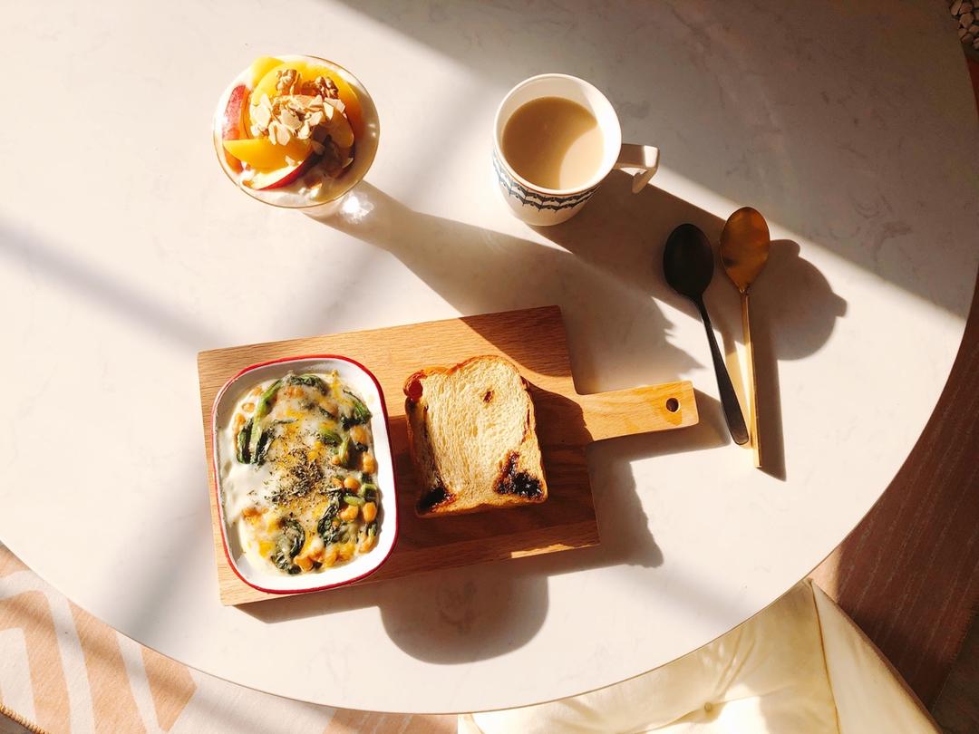 冲绳黑糖吐司、西班牙烤蛋、桃子谷物酸奶、枫糖奶茶