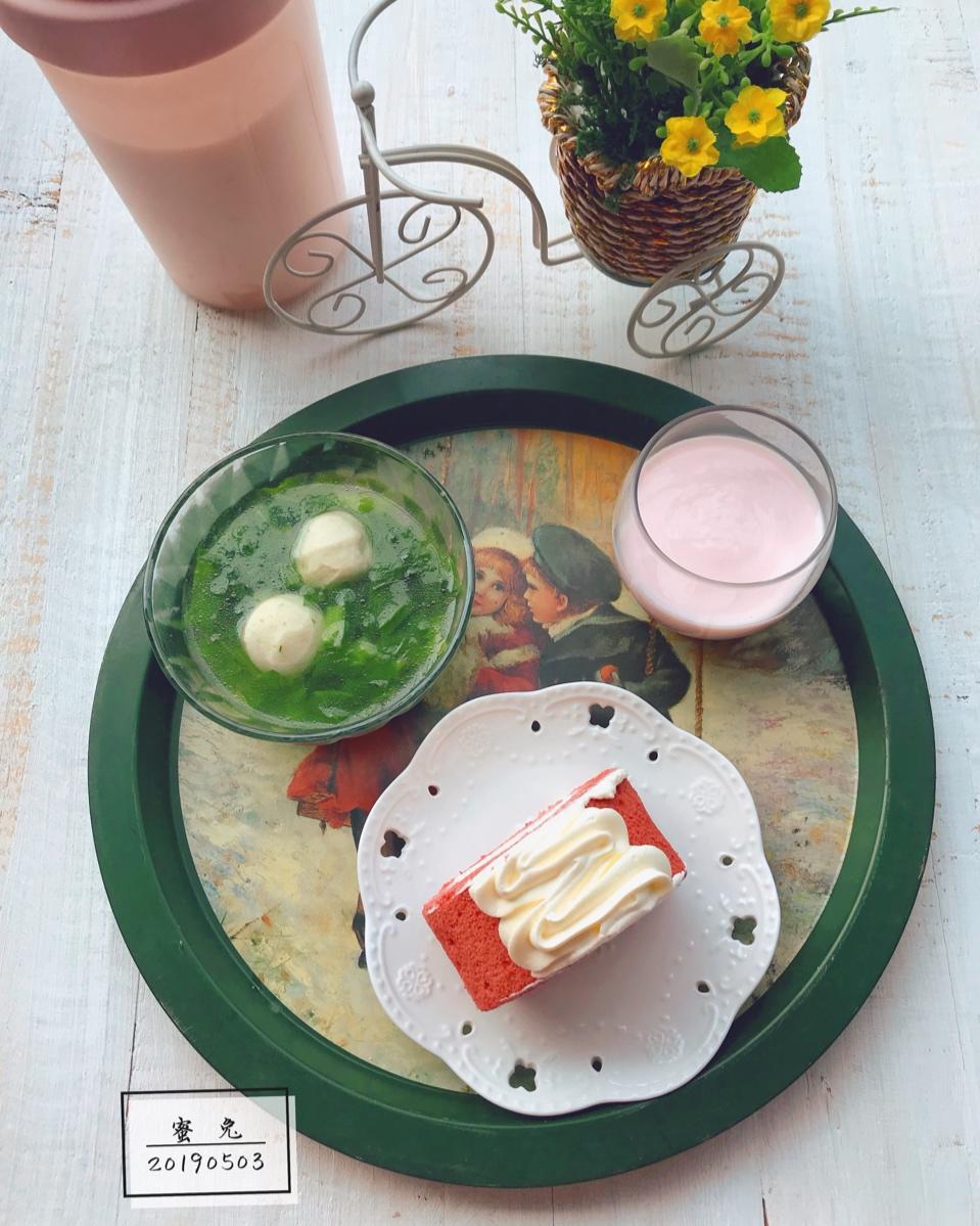 蜜兔媛 做过 早餐•2019年5月3日 #早餐•2019年5月3日#生活从未变得轻松,是你在一点一点地在变强大!加油,新的一天[太阳]假期简餐~~自制草莓酸奶~鱼丸菠菜汤~红丝绒蛋糕卷 2019-05-03