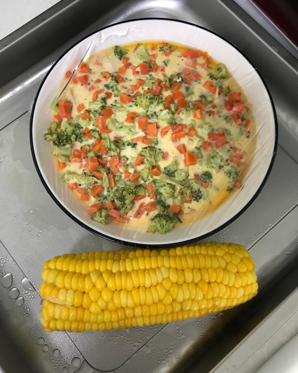 sea_00 做过 减肥餐 #减肥餐#西兰花半朵,切小朵,胡萝卜四分之一根切丁,鸡胸肉一小块切丁洗净用点酒、盐巴、生抽腌制片刻。拿一个盘子打入两个鸡蛋,和西红柿胡萝卜丁搅拌均匀,再撒一些盐巴。鸡胸肉在盘子摆在底下,上面均匀撒开胡萝卜鸡蛋西兰花的料,贴好保鲜膜,放入蒸箱蒸20分钟。 2019-05-11