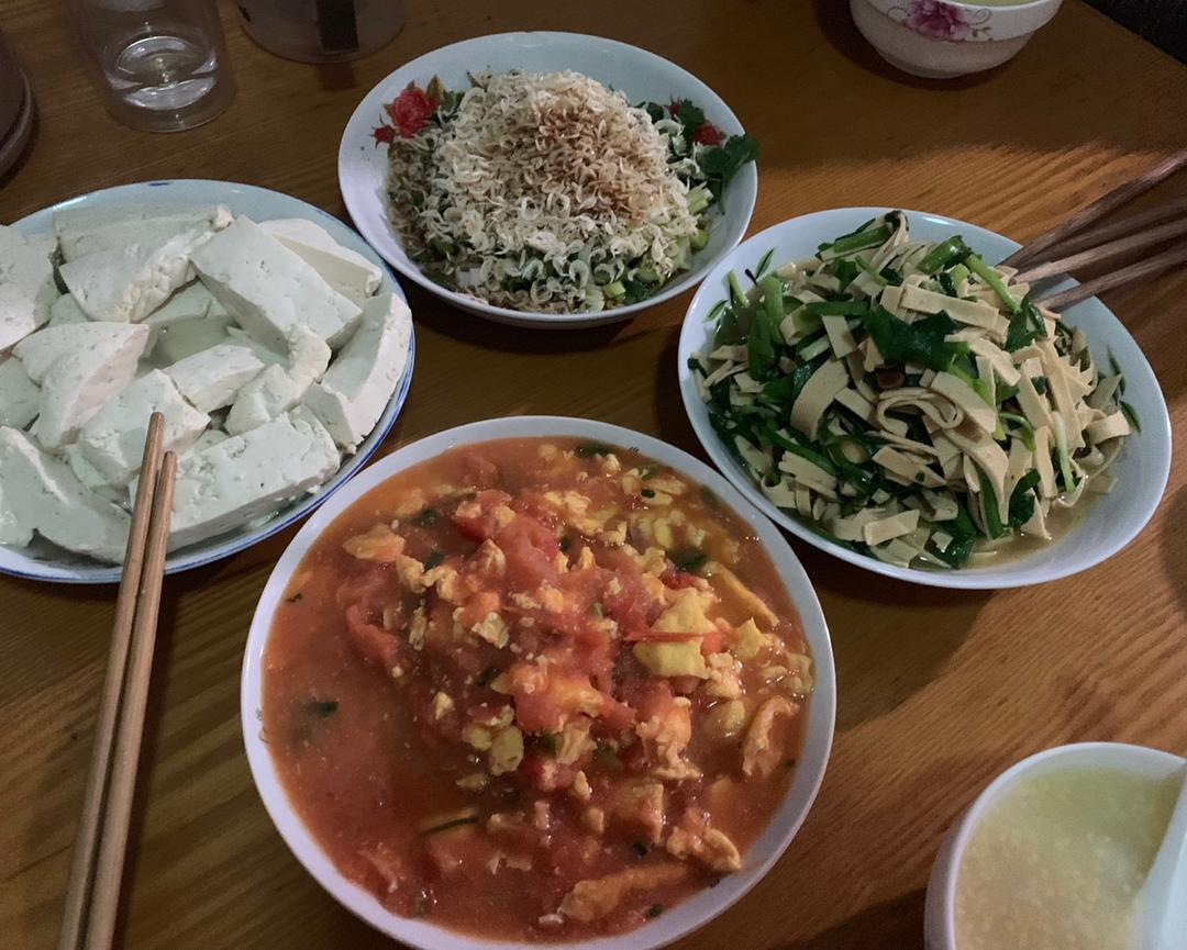 美味的晚餐(番茄炒鸡蛋真的是妹妹的最爱了,韭菜炒豆腐皮、嫩豆腐拌小葱虾皮、小米粥)