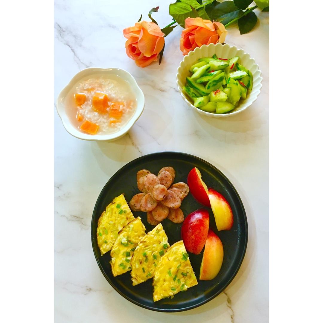 jessie妈 做过 早餐•2019年5月16日 #早餐•2019年5月16日#🌷早安~蒲菜煎蛋饼🥞烤肠油桃🍑红薯粥🍠🥣炝拌黄瓜🥒真正想做成一件事,不取决于你有多少热情,而是看你能多久坚持。千万别奢望光有热情就能得偿所愿💕💕💕 2019-05-16