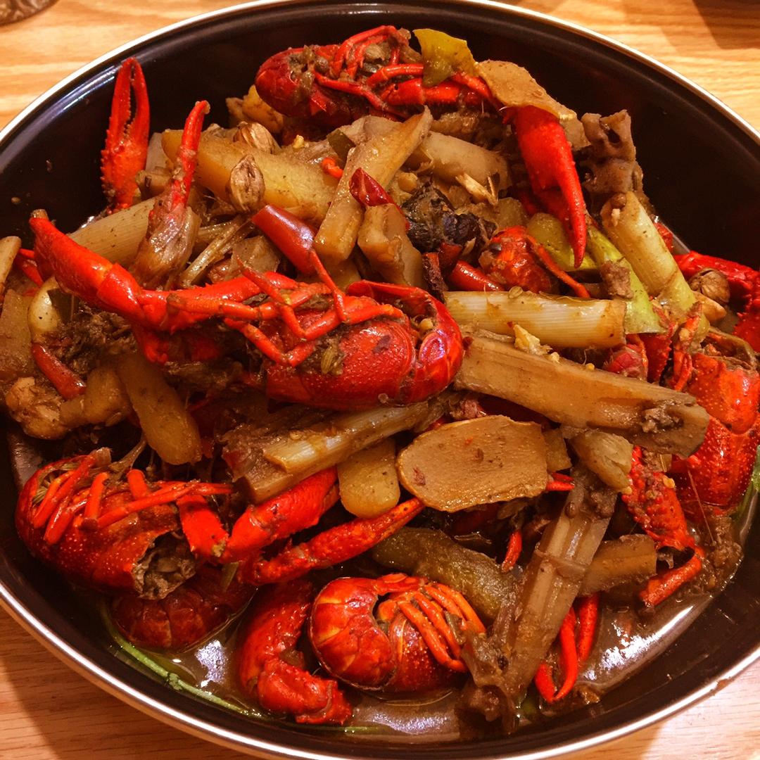 武汉很多小龙虾店都是甜辣味的,个人不喜欢。自己做了麻辣味的,配菜有藕,土豆,黄瓜,还加了香菜。