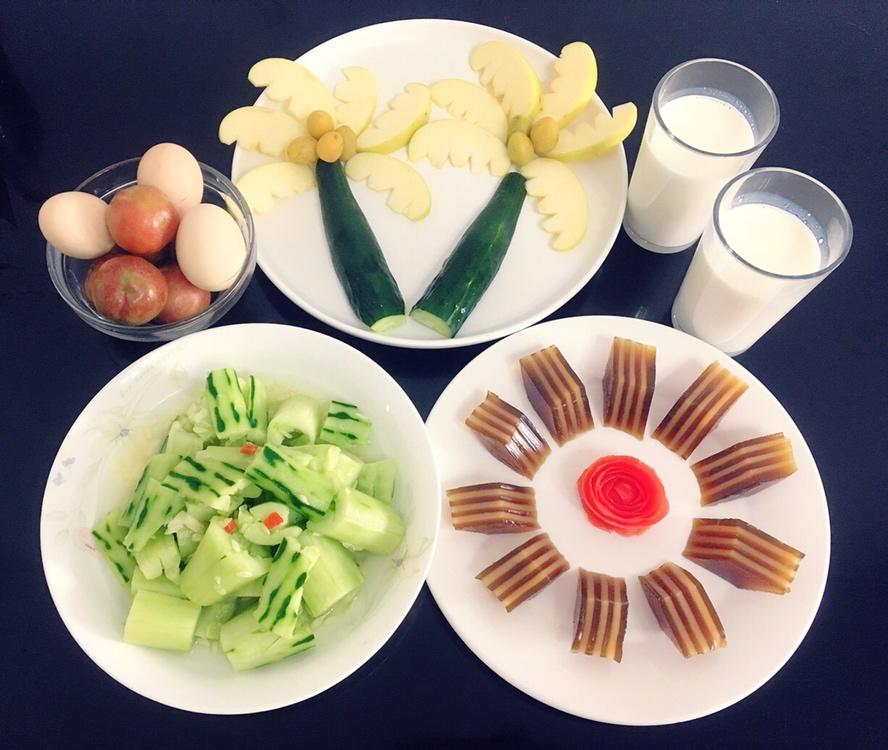 牛奶+椰汁千层糕+鸡蛋+凉拌青瓜+苹果+李子+黄皮