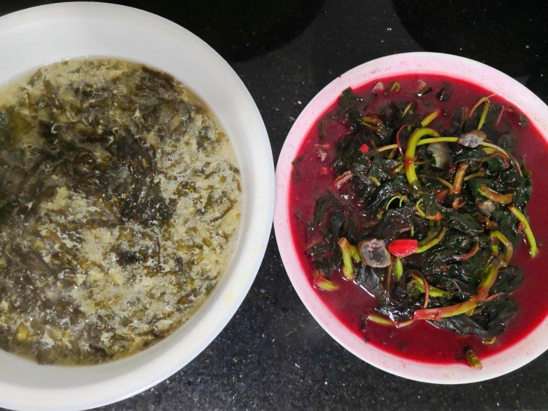 沧海仙踪 做过 午餐•2019年5月19日 #午餐•2019年5月19日# 皮蛋苋菜:爆香蒜子,放苋菜炒,加水,加皮蛋,勾芡。紫菜汤:烧开水放紫菜,再次烧开加点水淀粉打蛋花,撒葱花。蛋花打太碎了,还有蛋腥味,是哪里不对(~_~;) 2019-05-19