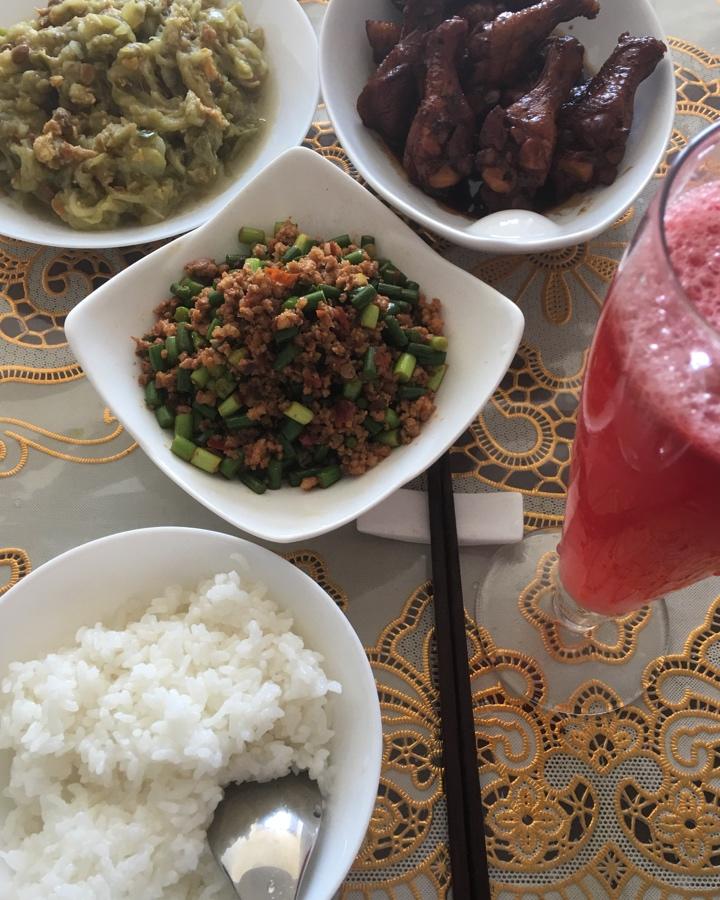 可乐鸡翅根、肉末炒蒜苔、茄子拌土豆、米饭、西瓜汁