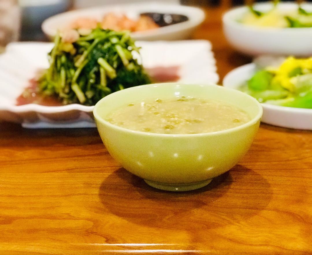 绿豆小米粥,小米煮粥还是直接滚水下锅大火煮最好吃,绿豆加足水量用快速锅压下,开锅直接加入小米中大火煮10来分钟,软糯好吃[色]